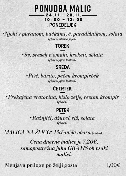 Samopostrežna juha GRATIS ob vsaki malici. Menjava priloge po želji gosta 1 €.